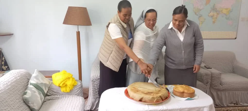 Our Sisters joined in the festivities, starting the day with a special Mass. This religious service was an opportunity for everyone to come together, give thanks, and seek blessings for the year ahead. Following the Mass, the celebration continued with a communal meal. Sharing food is a central part of Ethiopian culture, symbolizing togetherness and hospitality. The table was filled with traditional dishes, each prepared with care and love. As everyone gathered to eat, laughter and conversation filled the air, creating an atmosphere of warmth.